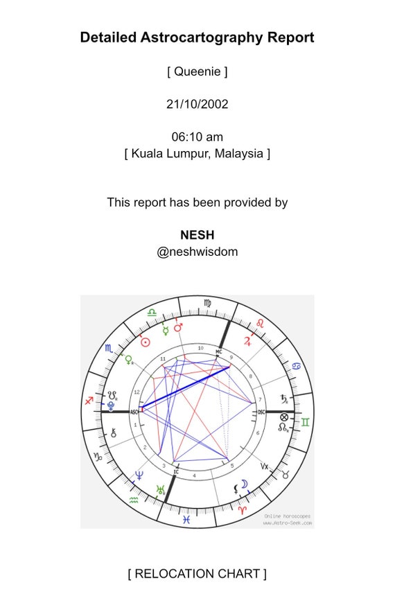Relocation chart calculator astrology A relocation chart is a natal horoscope moved to a different location. It's a chart cast for the same cosmic instant of birth, but looked at from another location, as if the birth happened there. The planets' sign positions all remain the same, but they will appear in different houses at different locations, thus altering their strengths. 2021. 5.