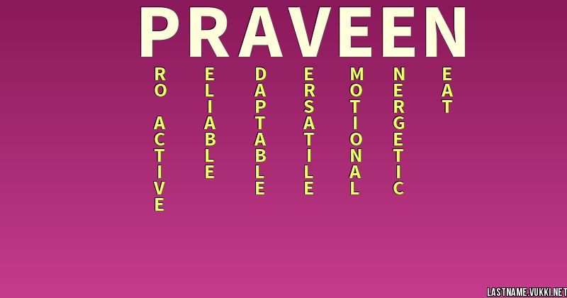 Praveen Name Meaning - Babynology Character Analysis of Praveen : Persons with the name Praveen, are seeker of wisdom and knowledge. They have a deep desire and yearning to learn and they ...