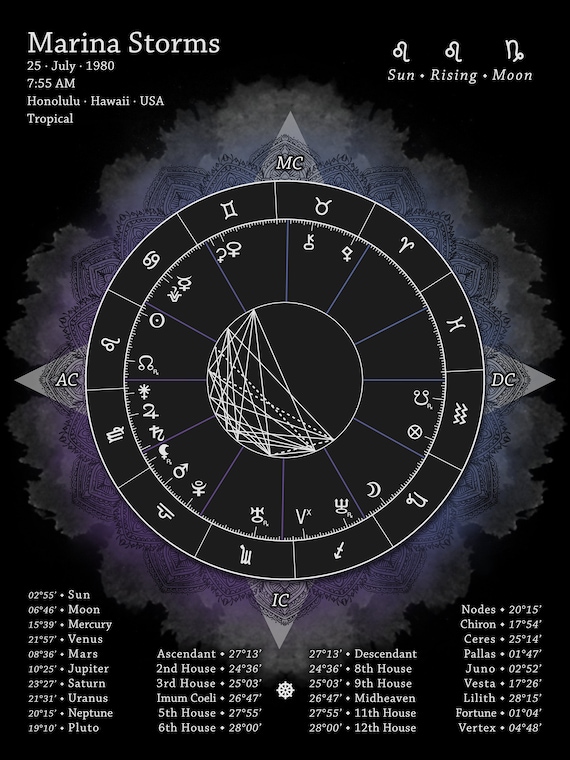 Birth Chart Calculator - Find Your Sun, Moon and Ascendant ... - Astrology A natal chart or birth chart is a map of the sky including the positions of the planets for the time that you were born. Where you are born has an impact on what is seen in the sky, e.g., if two people were born on the same day and at the same time but in a different city and country, what is seen overhead would be different. This would mean ...