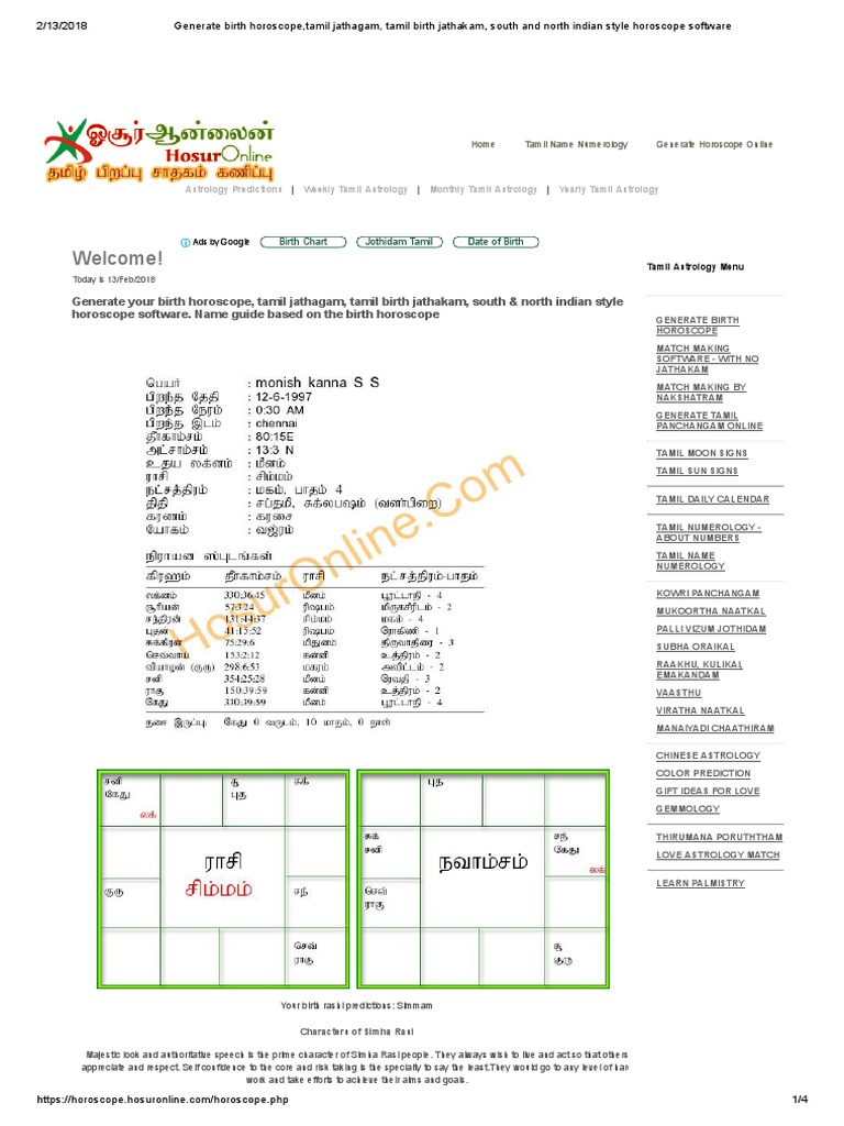 Jathagam | ஜாதகம் தமிழில் | Tamil Horoscope by Prokerala.com This Tamil astrology software helps you create your accurate Tamil horoscope. Your free jathagam includes planetary positions ( கிரக நிலைகள்), birth chart (ஜாதக கட்டம்), cevvai dosham (செவ்வாய் தோஷம் ) & shani dasa (ஏழரை சனி) analysis and more. Language/மொழி பெயர் பாலினம் ஆண் பெண் பிறந்த இடம் பிறந்த தேதி பிறந்த நேரம் Tamil horoscope Tamil Nadu student admits to poisoning lover over ‘astrology ... Verkko31.10.2022 · Tamil Nadu student admits to poisoning lover over ‘astrology prediction ... he did not raise any suspicion about her but claimed that she will never poison him as she was in love with him.