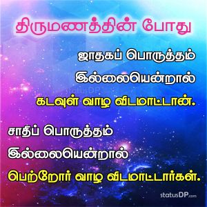 Astrology Views On love Marriage In Tamil Community As per the Marriage Astrology in the Tamil community, the marriage alliance can only be fixed if all the ten poruthams in the boy's and girl's horoscope are matched. The two can tie a knot only after the priest gives his consent for the matchmaking. The matchmaking is not ignored in the Tamil community even if it is a love marriage.